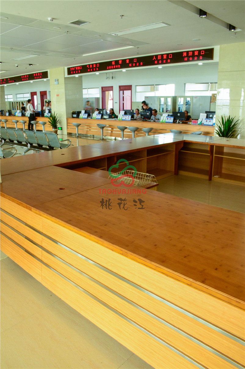桃江縣政務(wù)服務(wù)中心是桃江縣委、縣政府為了優(yōu)化投資環(huán)境、提高辦事效率、更好地為廣大群眾和投資者服務(wù)而設(shè)立的正科級(jí)事業(yè)機(jī)構(gòu)。政務(wù)中心大廳內(nèi)的辦公桌全部使用桃花江竹材科技的普竹材料打造,色澤鮮明,質(zhì)地環(huán)保,整體感覺簡(jiǎn)約清新。竹材清正廉潔的高品質(zhì)正好與政務(wù)中心的宗旨:陽(yáng)光行政、勤廉公平、服務(wù)至上、便民利民相互呼應(yīng)。